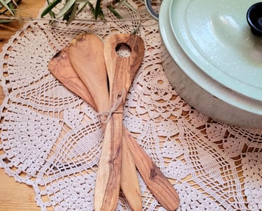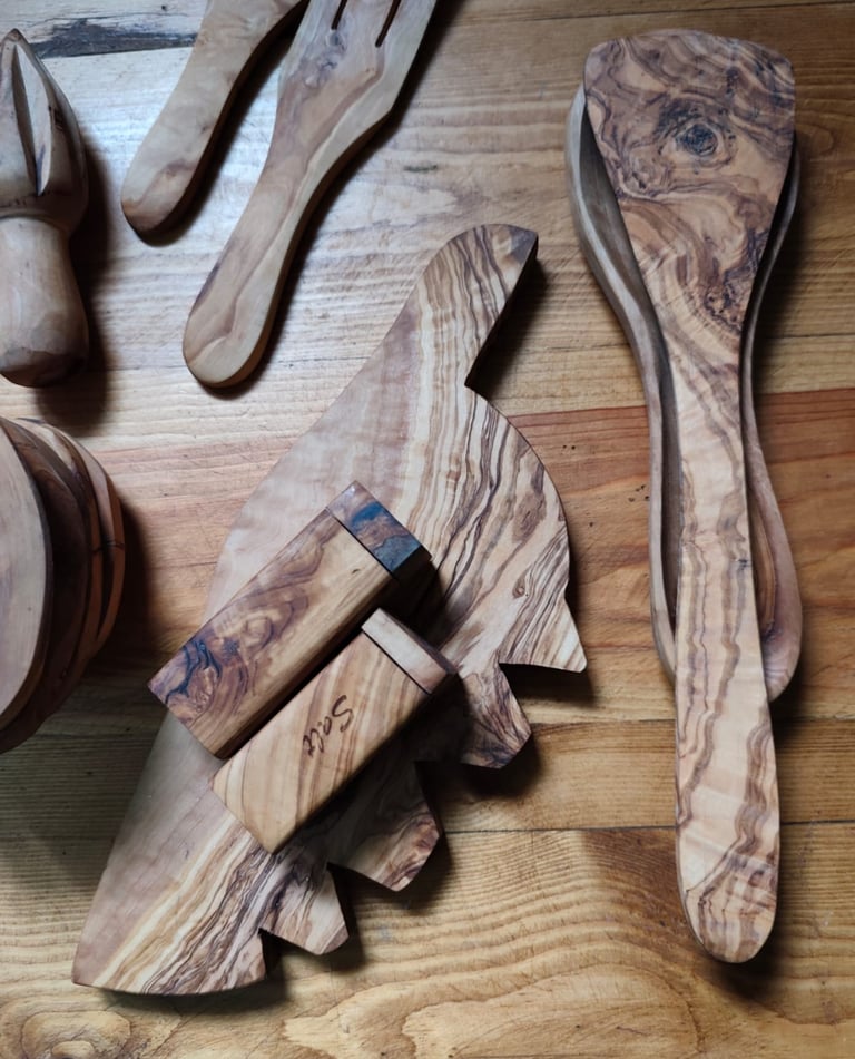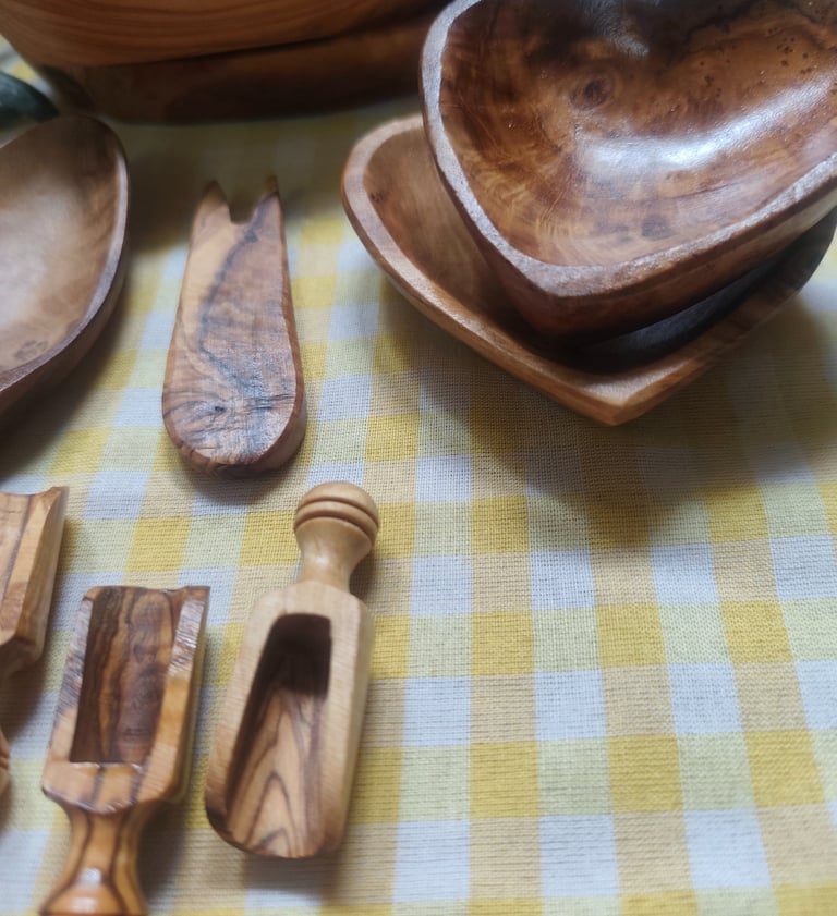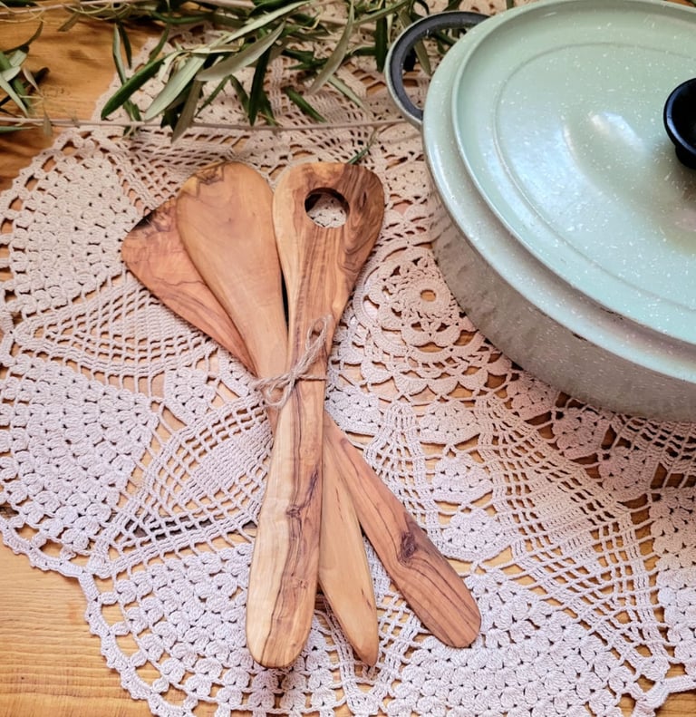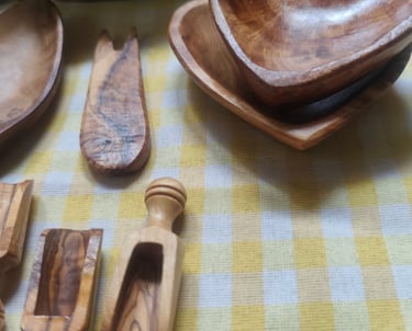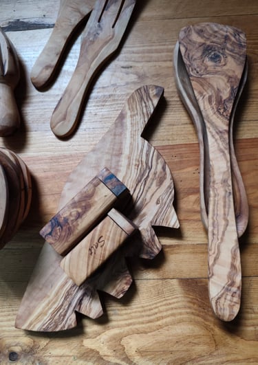 Ici, chaque ustensile en bois d’olivier est façonné à la main, avec de légères variations qui rendent chaque pièce unique et authentique.